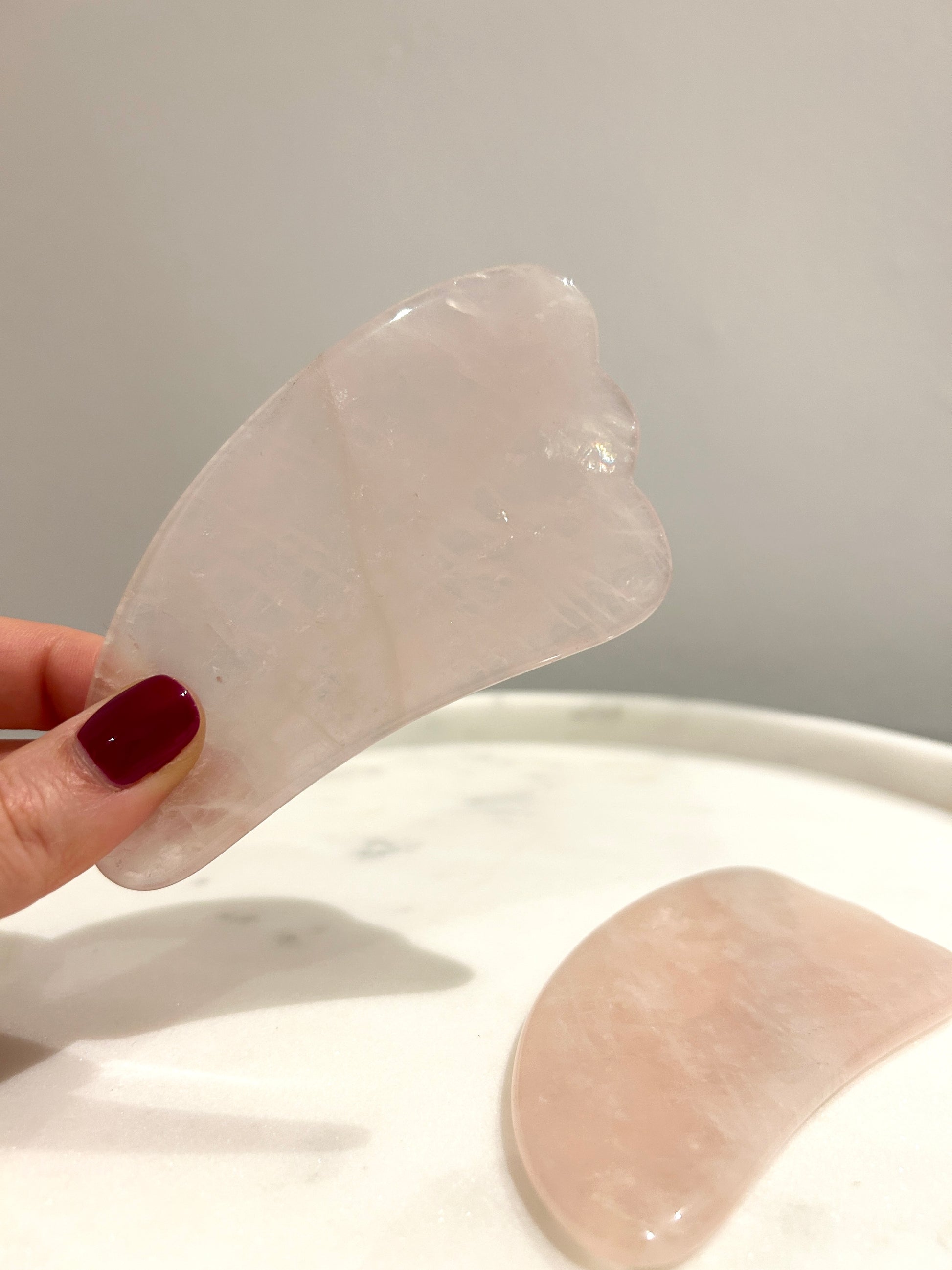 Gua Sha ist eine traditionelle chinesische Technik zur Förderung der Gesundheit und des Wohlbefindens. Dabei wird ein spezielles Werkzeug, oft aus Jade oder Rosenquarz, über die Haut geschabt, um Spannungen zu lösen, die Durchblutung zu verbessern und den Energiefluss im Körper zu harmonisieren.